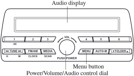 Switch the ignition to ACC or ON. Press the power/volume dial to turn the audio system on. Press the power/volume dial again to turn the audio system off.