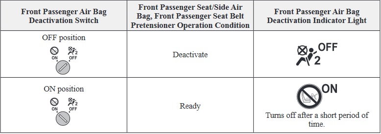 When the ignition is switched ON, both front passenger air bag deactivation indicator lights illuminate regardless of the front passenger air bag deactivation switch position.