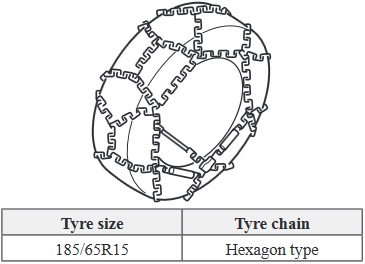 If tyre chains are to be used, replace both the front and rear tyres with 185/65R15 tyres and replace both the front and rear wheels