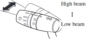 The headlights switch between high and low beams by moving the lever forward or backward.